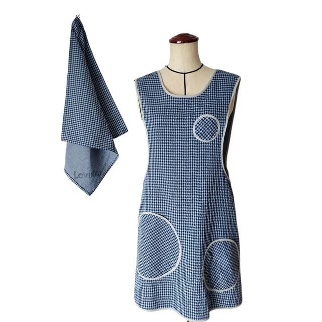 パイピングエプロン&クロスセット marupoke ブルー系千鳥格子