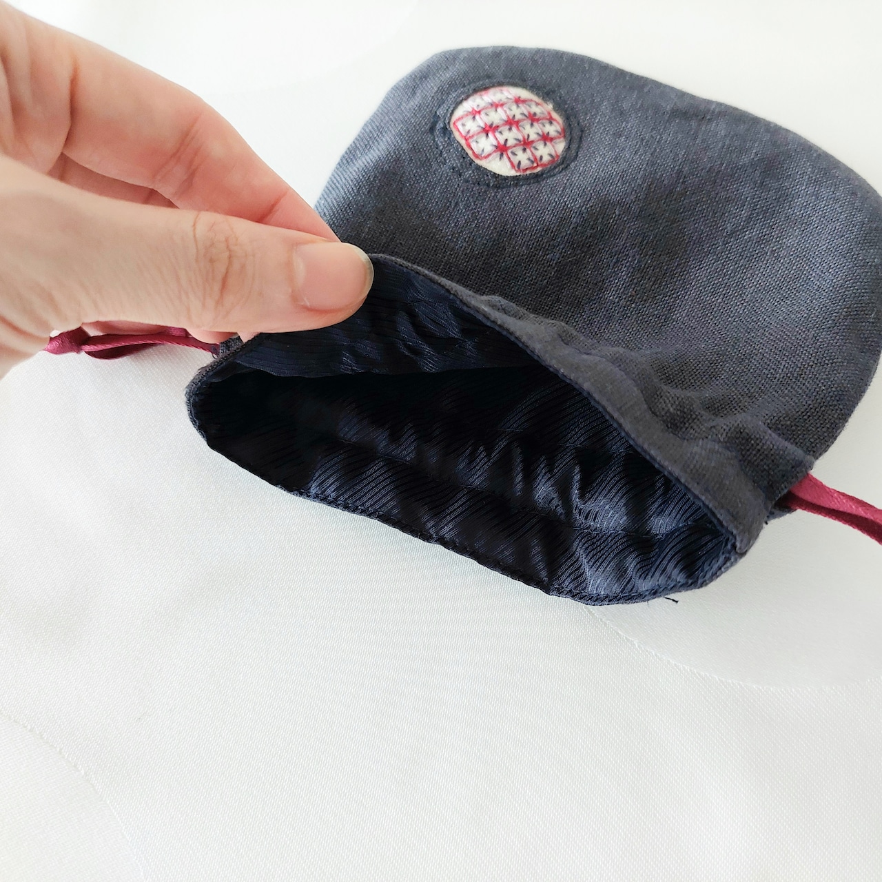 飴ちゃん、アクセサリーや、小さなコスメ、お薬や、印鑑等、小さなものをまとめるのにちょうど良い小さな小さな手のひらサイズの巾着です。